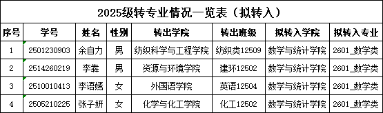 公示时间为2025年12月12日——12月18日,公示期间如对拟转入录取名单有异议,请与数学与统计学院办公室联系。