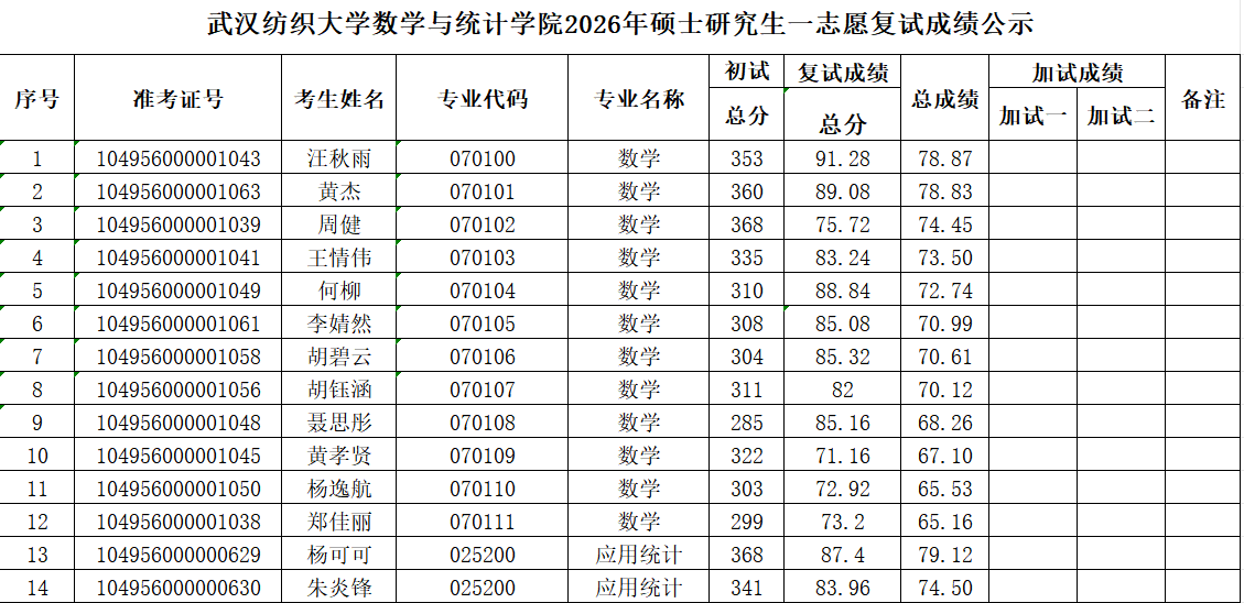 2026年招收攻读硕士学位研究生复试录取办法》等文件精神,我院于2026年3月26日规范组织开展了2026年硕士研究生复试工作。经专业课笔试、外语能力测试、综合素质面试等环节,已全部完成2026年我院研究生招生复试(第一志愿)工作,复试成绩已报学校审核,现公示如下