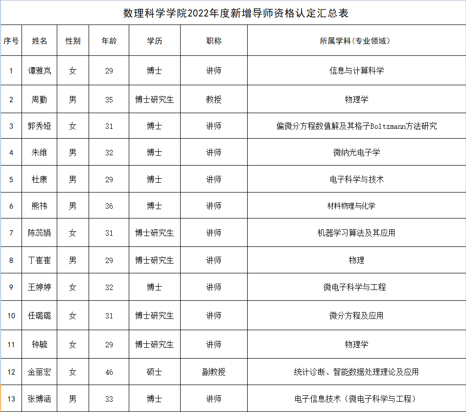 根据《羞羞漫画 硕士研究生导师管理及考核办法(暂行)》及《数理科学学院2022年度新增硕士研究生导师资格认定的审定办法》,现将我院2022年新增硕士研究生导师名单公示如下: