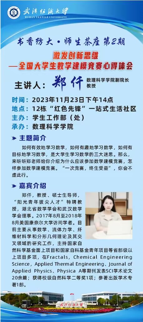 上一条:数理科学学院举办第四期书香纺大师生茶座 下一条:数理科学学院关于2023年研究生攀登奖学金、优秀研究生和优秀研究生干部拟推荐名单公示