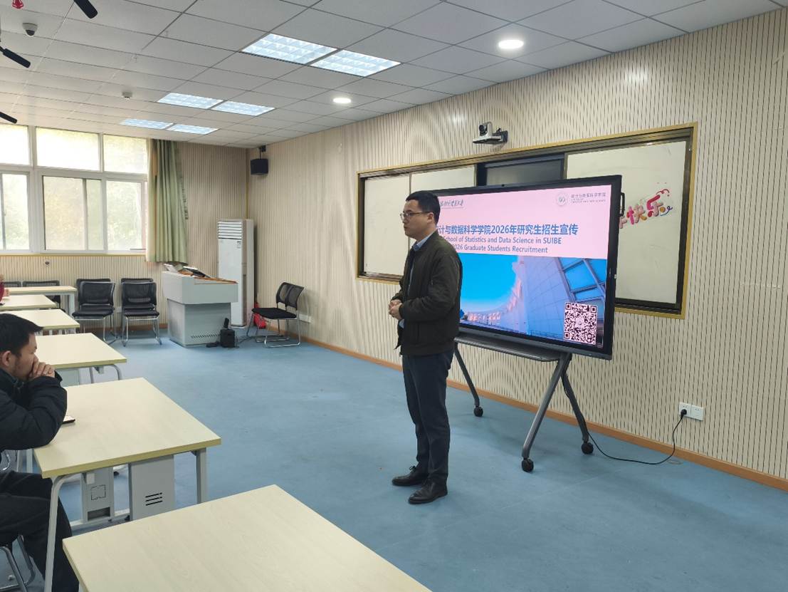 邀请上海对外经贸大学统计与数据科学学院于崇文楼205教室召开研究生招生宣讲会。学院党委副书记陈国鹏主持会议,上海对外经贸大学统计与数据科学学院党委副书记范鸣,23级辅导员方媛及23级意向考研的学生参加会议。