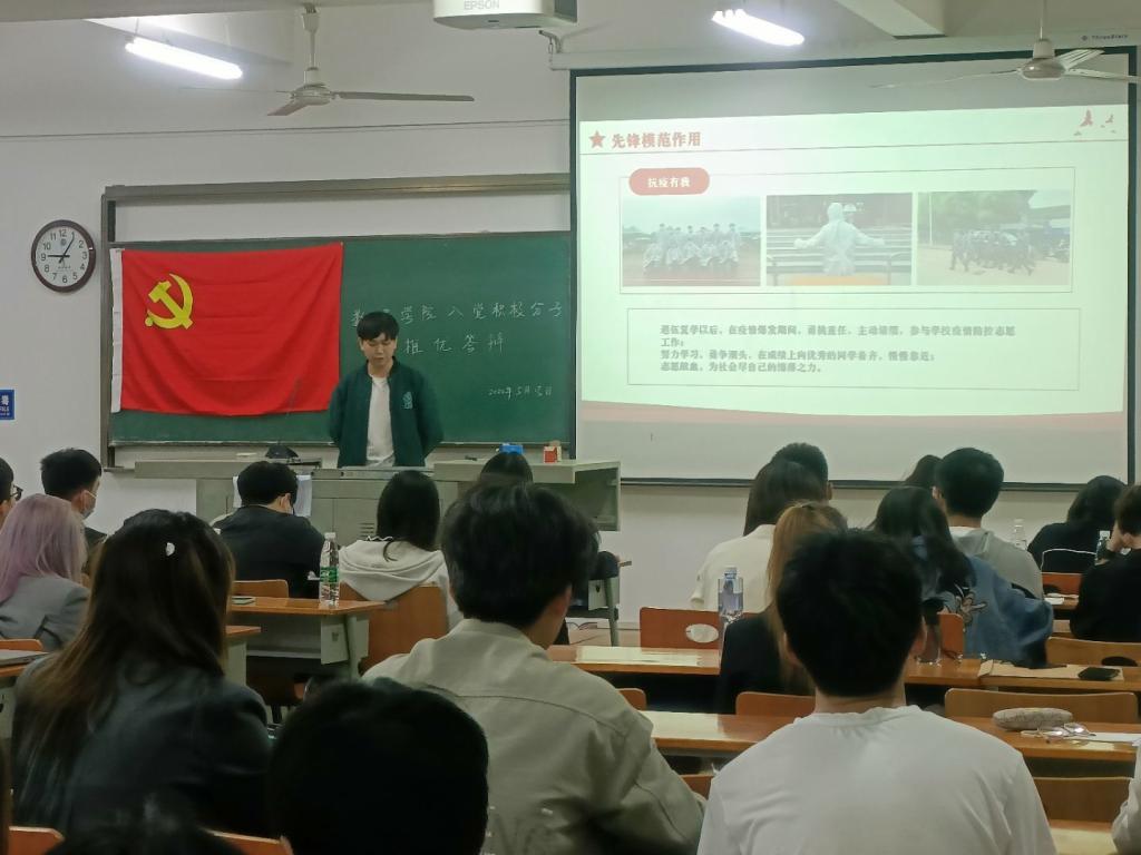 本次会议以答辩汇报、群众代表发言、支委提问和党员打分四个环节展开。在答辩环节中,36名入党积极分子依次从个人介绍、入学以来的作为、入党动机、对中国共产党的认识、在日常生活中如何发挥先锋模范作用等方面进行个人展示,群众代表上台发言。支委针对入党积极分子们的现实表现和思想情况等方面进行考察提问,与会党员根据入党积极分子们的表现进行综合评分。