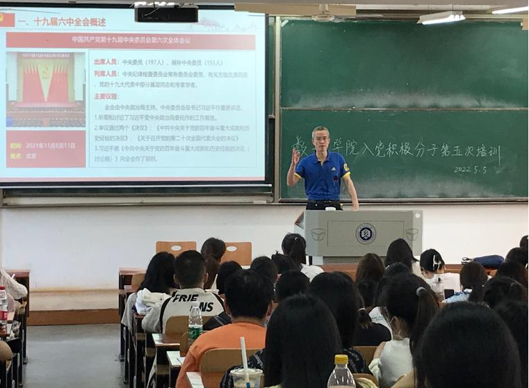 为帮助入党积极分子深入学习党的十九届六中全会精神,提高思想认识和政治觉悟,2022年5月5日下午,数理科学学院党委书记段溢波以“不忘百年奋斗路,接续赶考新时代”为主题,在崇志楼119教室为入党积极分子进行授课。