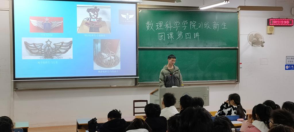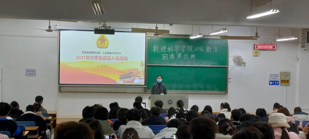 “青年自强,国之所望;征兵固防,安国兴邦。”踊跃报名参军是每一位有志青年的光荣选择。为点燃大学生从军报国的情怀,激励大学生携笔从戎、献身国防的热情,调动同学们参军入伍、报效祖国的积极性。12月12日晚,数理科学学院组织开展以“参军报国,青春的荣耀”为主题的团课活动。辅导员方媛、数理学院大一新生悉数参与此次团课。