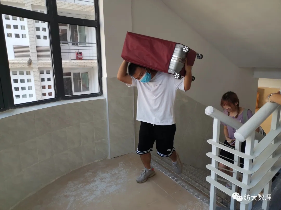除了一对一志愿者,学院同时在北门以及报道点安排数十名志愿者,他们以饱满的精神状态投入到迎新工作之中,分工协作、环环相扣。有的人在报道点核对新生材料,办理报道手续;有的人在两地来回奔波,有的人利用拖车帮助新生搬运数件行李;有的人一趟趟搬着厚重的行李爬上五楼。他们总是出现在最需要他们的地方,纺大每个角落,都能看见我院志愿者忙碌的身影。志愿者们用热情的心、真诚的笑带领新同学走进纺大,走进数理。“我觉得学院的迎新工作做得很好,我从进校手里都没有拿行李,学长学姐们都非常热情地帮助我报道…”这是数理学院采访员在采访过程中听到最多地一句话。