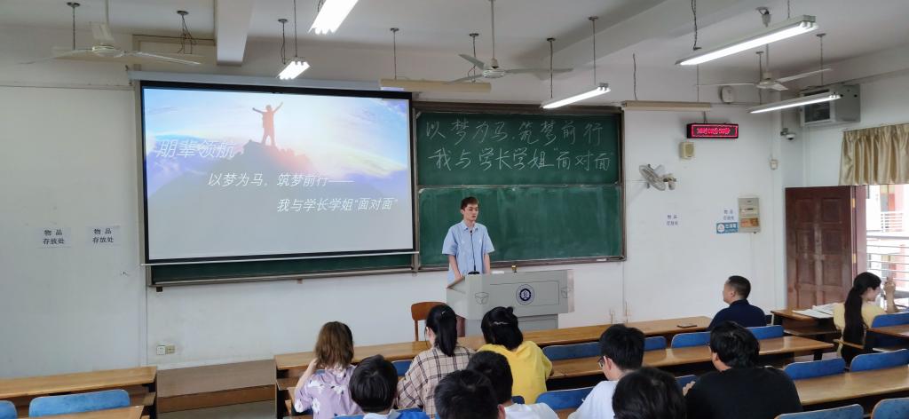 会议伊始,主持人万毅以“以梦为马,筑梦前行”为主题,介绍了开展此次交流会的目的和意义:提供机会使在读学子与优秀学长学姐交流,拓宽眼界增长经验,获得正能量。四位优秀毕业生代表依次介绍自己的考研与就业的经验和心得。