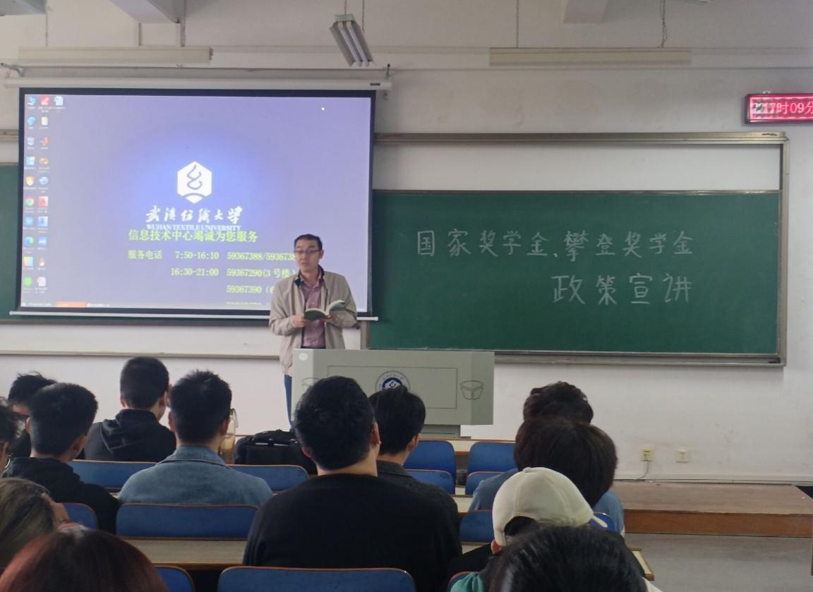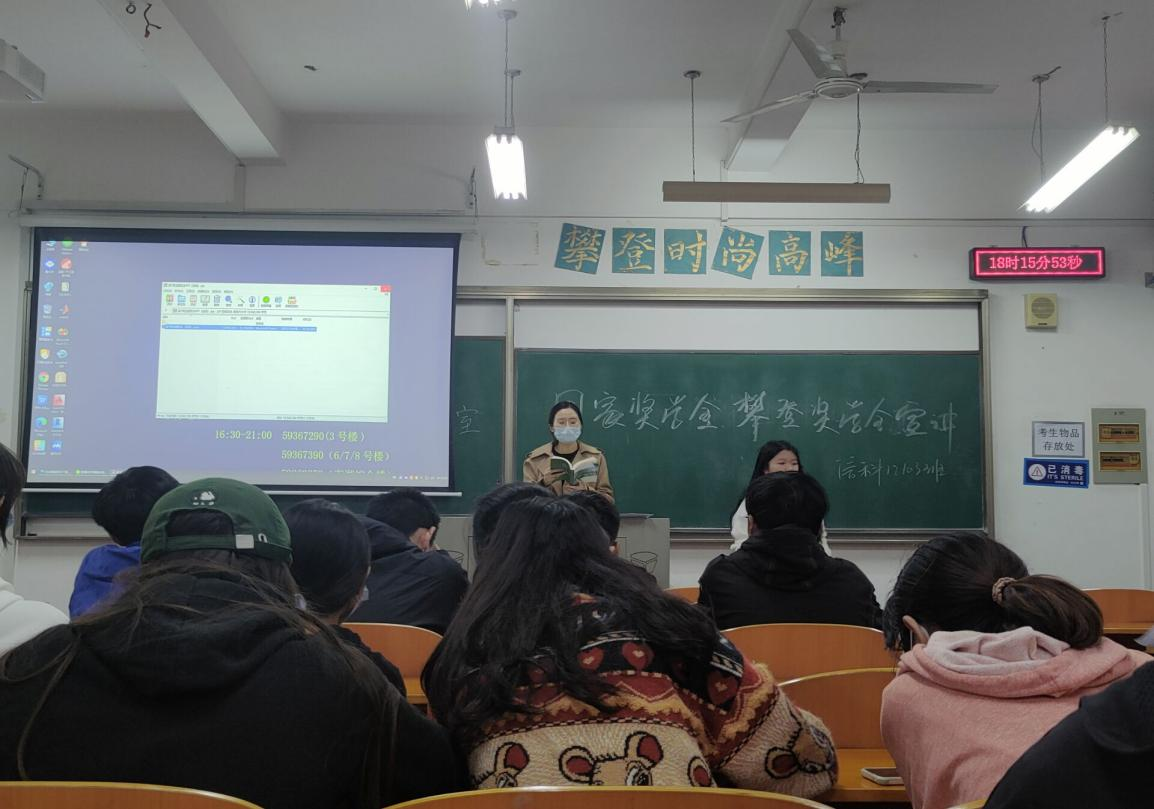 攀登奖学基金评选管理办法》,并向各班学生详细讲述了国家奖学金的评选条件及评选流程,着重强调了国家奖学金评选过程的严格性、透明性、精准性。