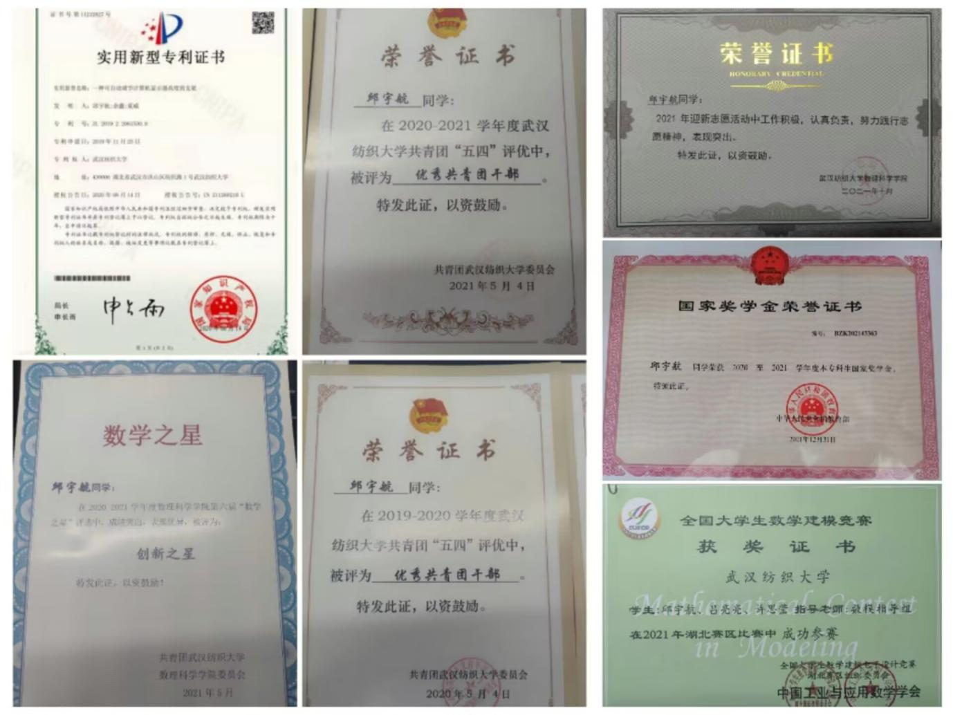 校国家励志奖学金,攀登奖学金,国家奖学金。曾多次参加美国大学生数学建模竞赛、全国大学生数学建模竞赛,在2019、2020、2021年美国大学生数学建模竞赛中获得S奖。并曾获得2021年溢达杯全国创意大赛校级优秀奖,主持2022 年大学生创新创业训练计划省级立项一项,取得实用新型专利一项。