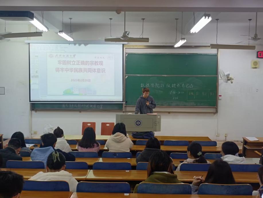 为筑牢同学们抵制宗教渗透校园的思想防线,进一步净化校园文化环境,引导同学们形成正确的世界观、人生观、价值观,数理科学学院于2月26日下午在崇文楼组织开展“抵制宗教渗透,防范校园传教”主题班会,带领同学们学习我国宗教政策相关内容。本次班会由各班班长主持,各年级辅导员、各班班主任及全体学生参与本次会议。