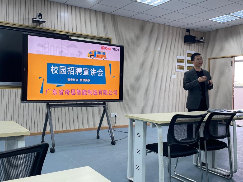 2月24日,广东省奇思智能制造有限公司在阳光校区四号教学楼205室召开企业宣讲会,旨在让同学们了解企业现状、岗位要求、人才培养等方面的信息,拓宽就业渠道,搭建就业平台,尽快找到心仪的工作。