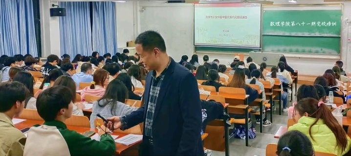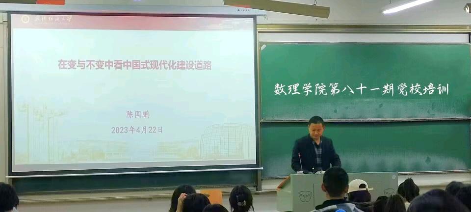 为进一步加强入党积极分子的培训、教育和考察,提升入党积极分子政治觉悟和理论水平,坚定理想信念,端正入党动机,2023年4月22日晚,数理科学学院党委副书记陈国鹏以“在变与不变中看待中国式现代化建设道路”为题,在崇志楼120教室为入党积极分子讲授党课。