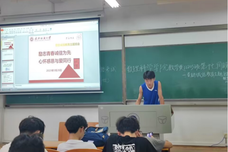 为了加强学生的诚信教育与管理工作,6月4日,数理科学学院各年级于崇志楼开展诚信教育主题班会。本次会议由各班班长主持,各班班主任、各年级辅导员及全体同学参加班会。