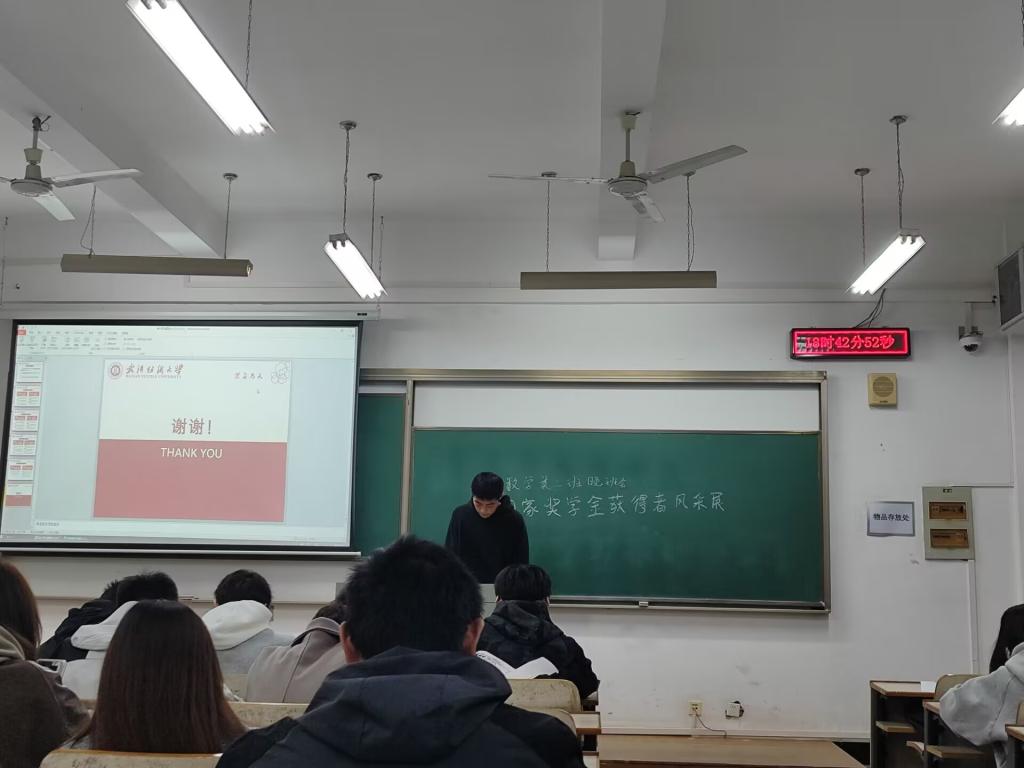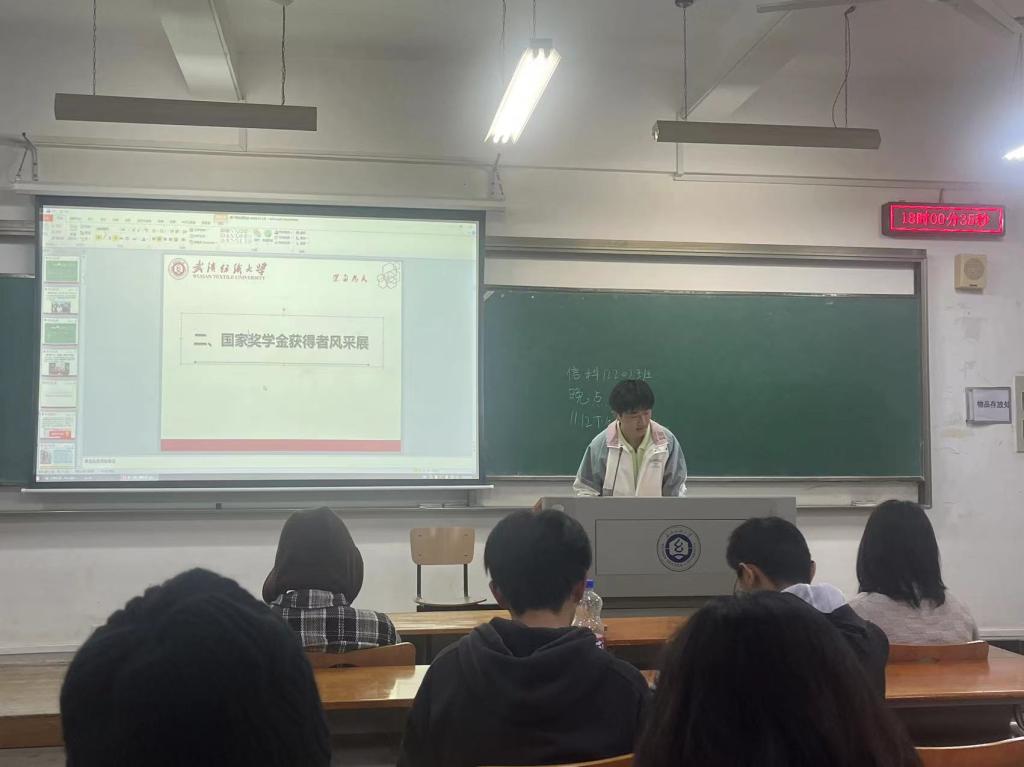 班会主要分为三项内容,第一项由团支书播放ppt展示国家奖学金获得者风采以及国奖获得者,向同学们介绍各学院优秀学员的经历和成果。