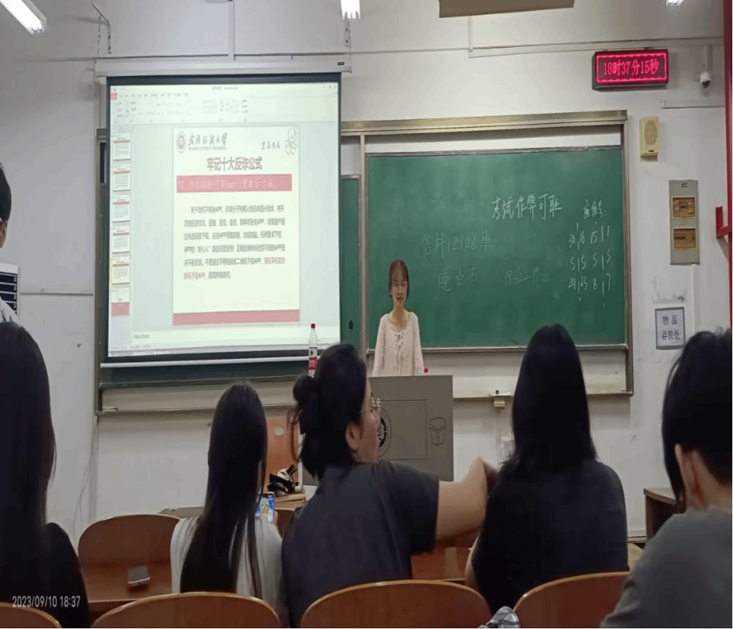 接着,各班班长开展预防电信网络诈骗知识普及,共同学习《中华人民共和国反电信网络诈骗法》相关内容,牢记十大反诈公式。提高了同学们的防范意识。