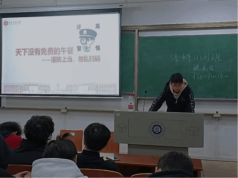 随后,团支书围绕“防止诈骗”进行了交流,指出“天下没有免费的午餐”这一道理。提醒同学们学会识别那些看似“免费”的陷阱和诱惑,避免因此而损失惨重。
