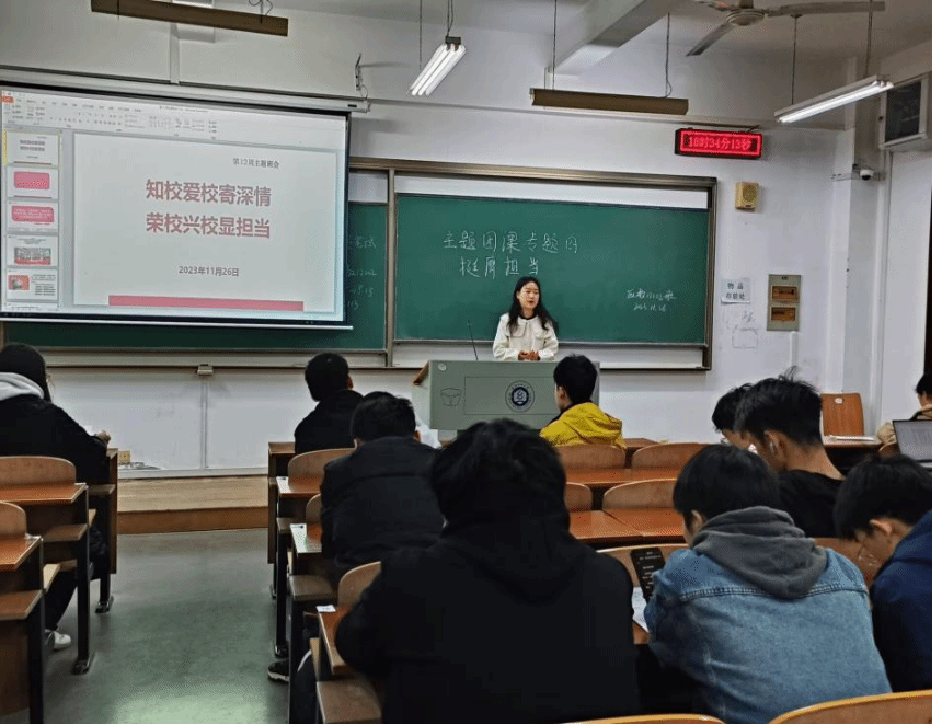 会议伊始,团支书传达了“知校爱校寄深情,荣校兴校显担当”主题团课内容,向同学们传达一份深深的爱校情怀和为学校繁荣发展而努力的责任与担当。