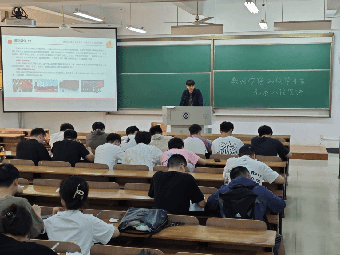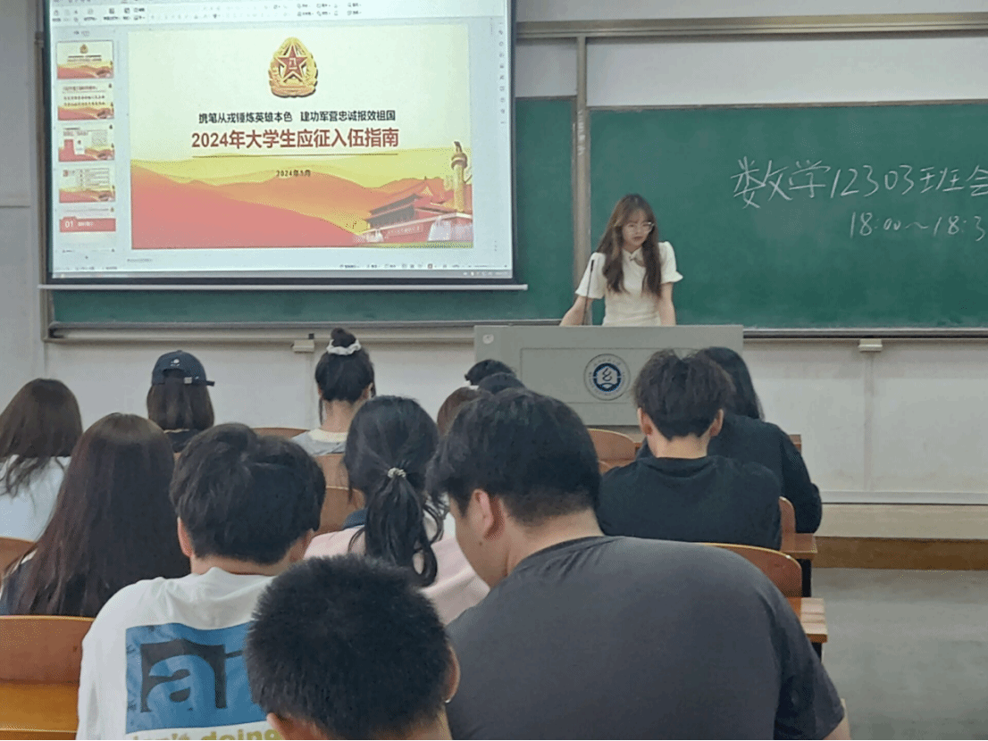为扎实开展2024年征兵宣传工作,为进一步加强对广大青年大学生的爱国主义教育,鼓励有志青年携笔从戎,5月12日下午,数理科学学院各班于3号教学楼开展了征兵宣讲,数理科学学院全体同学、各班班主任、各年级辅导员参与本次会议,本次会议由各班班长主持。