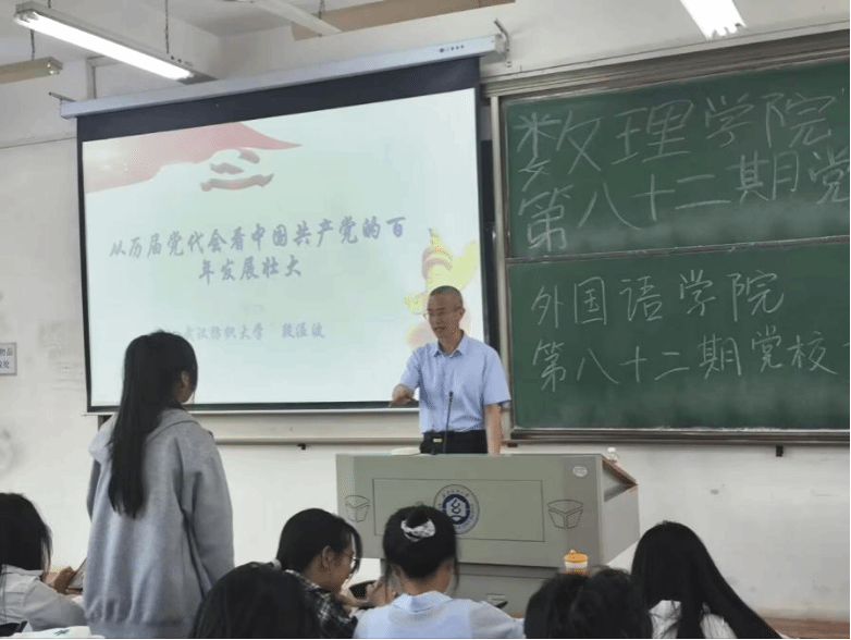 为了加强入党积极分子的理论学习,坚定理念信念,端正入党动机,2024年5月16日下午,数理科学学院党委书记段溢波以“以历届党代会看中国共产党的百年发展壮大”为题,在3教117教室为数理科学学院和外国语学院的入党积极分子讲授党课。
