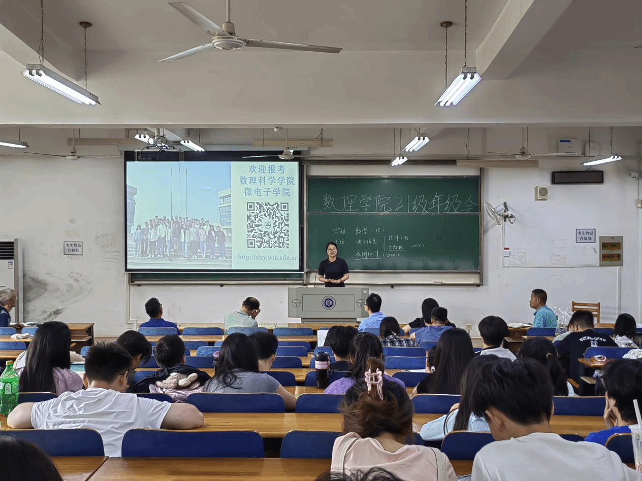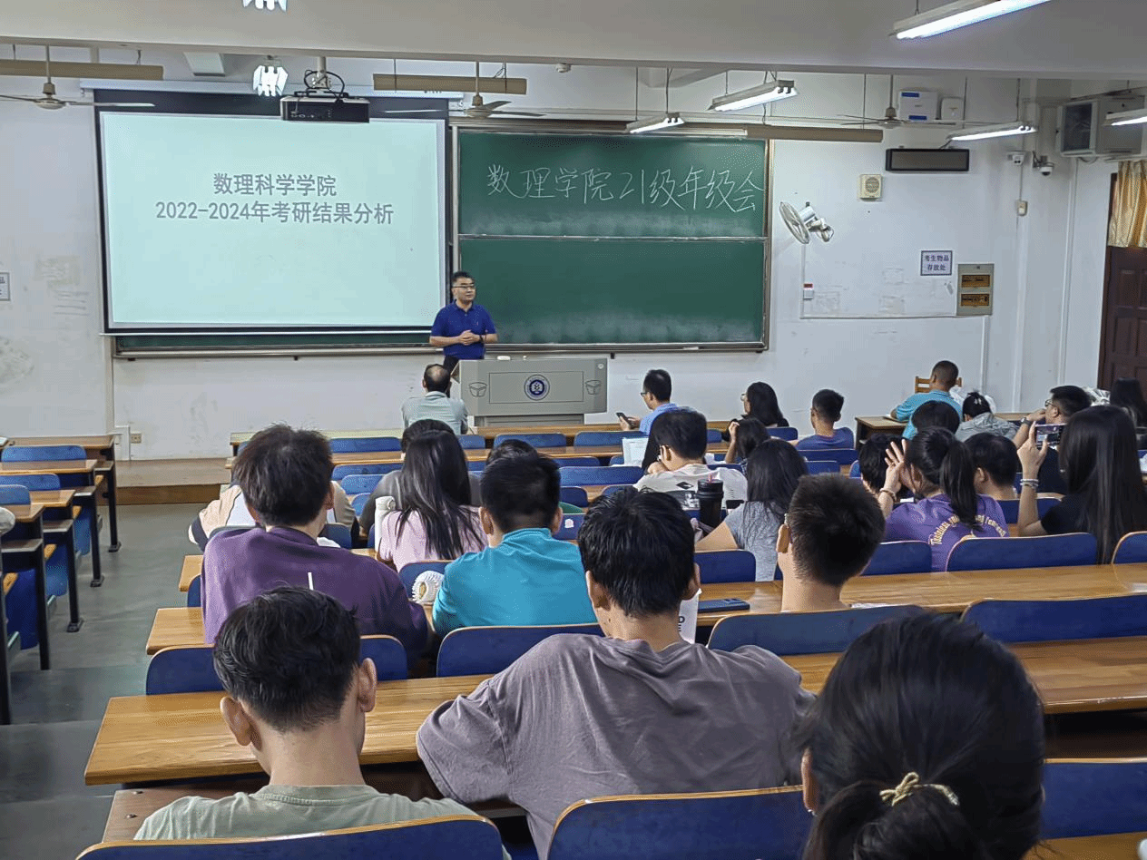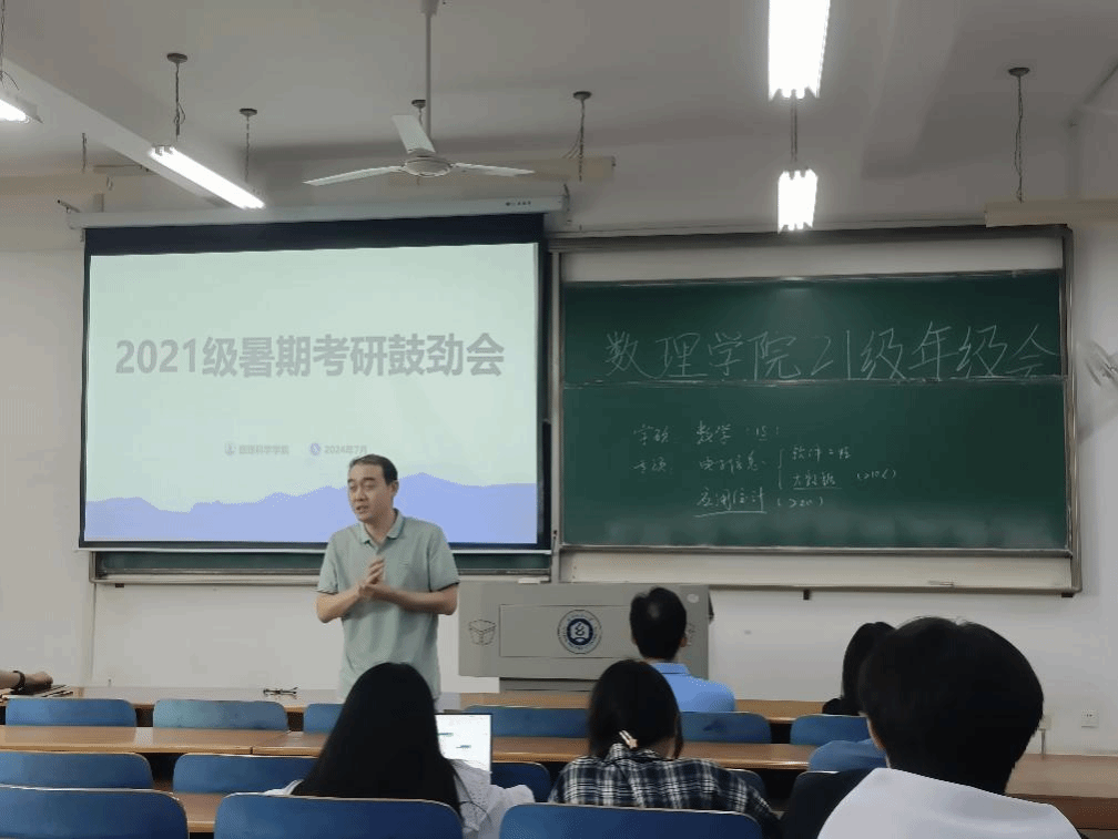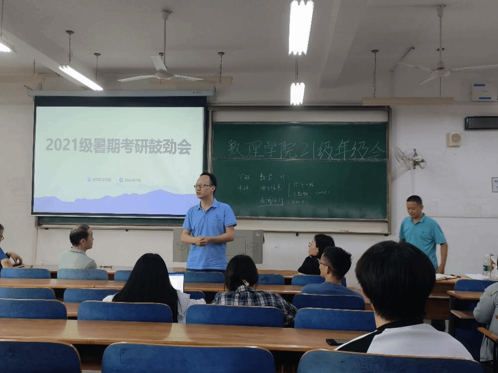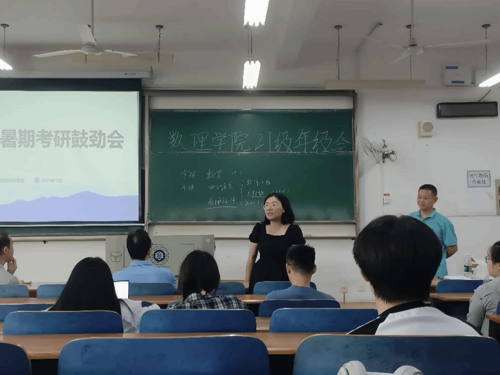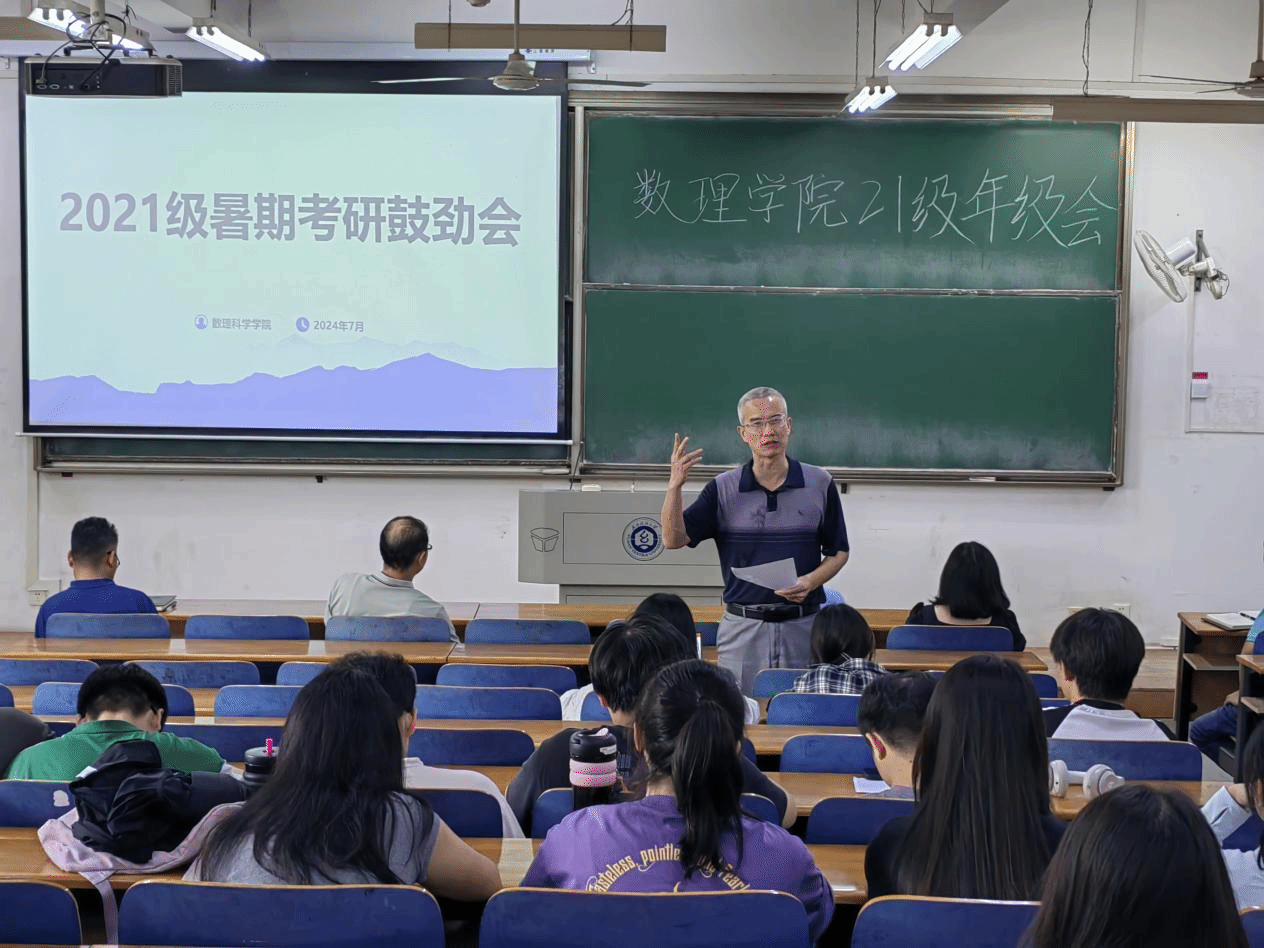 伴随着暑期的到来,数理学子全力备考,学院多措并举保障考研学子需求,7月12日下午,数理科学学院于崇志楼117教室开展考研鼓劲会,数理科学学院院长汪胜祥、院长党委书记段溢波、副院长郑仟、党委副书记陈国鹏亲临教室为大家鼓劲打气、专业教师及班主任王彦波老师、付红波老师、黄熙老师、钟毓老师,为同学们分享考研经验、答疑解惑。本次会议由陈国鹏书记主持,21级辅导员方媛及全体考研的同学参与本次会议。