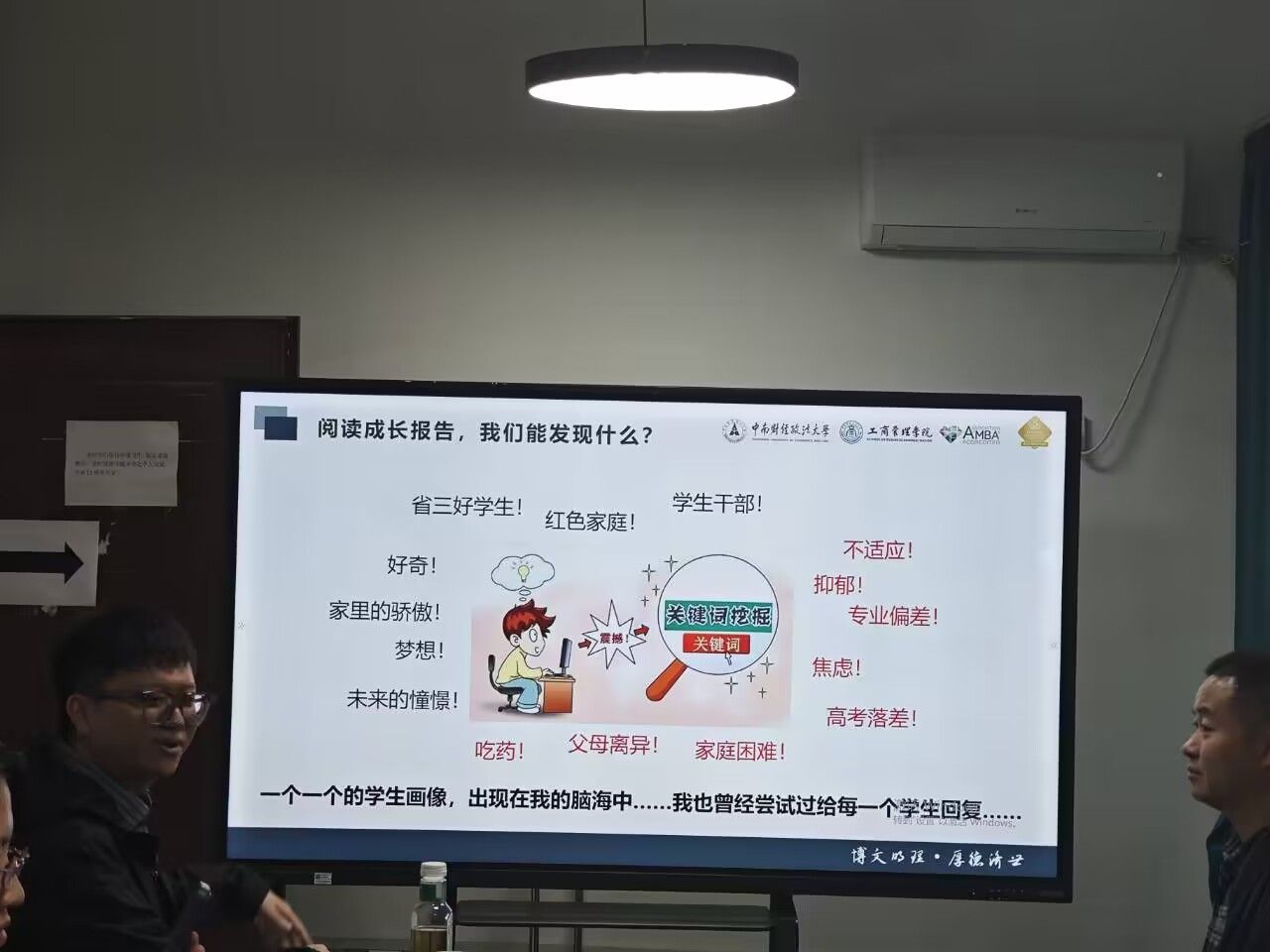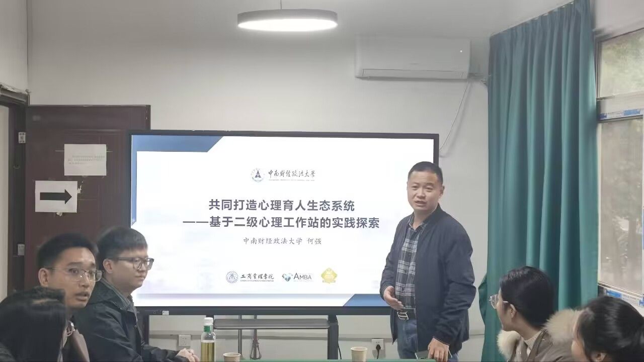 活动中,何强老师分享了中南财经政法大学在心理育人方面的创新实践。何强老师着重介绍了二级心理工作站的升级,这一举措显著提升了对学生心理健康需求的响应能力,他分享了如何通过设计心理文化活动,如“研心术”工作坊和“观心境”绘画治疗,来增强学生的心理健康意识和自我调节技能。何强老师还介绍了新生心理教育工具的有效运用,这些工具帮助新生顺利过渡到大学生活。
