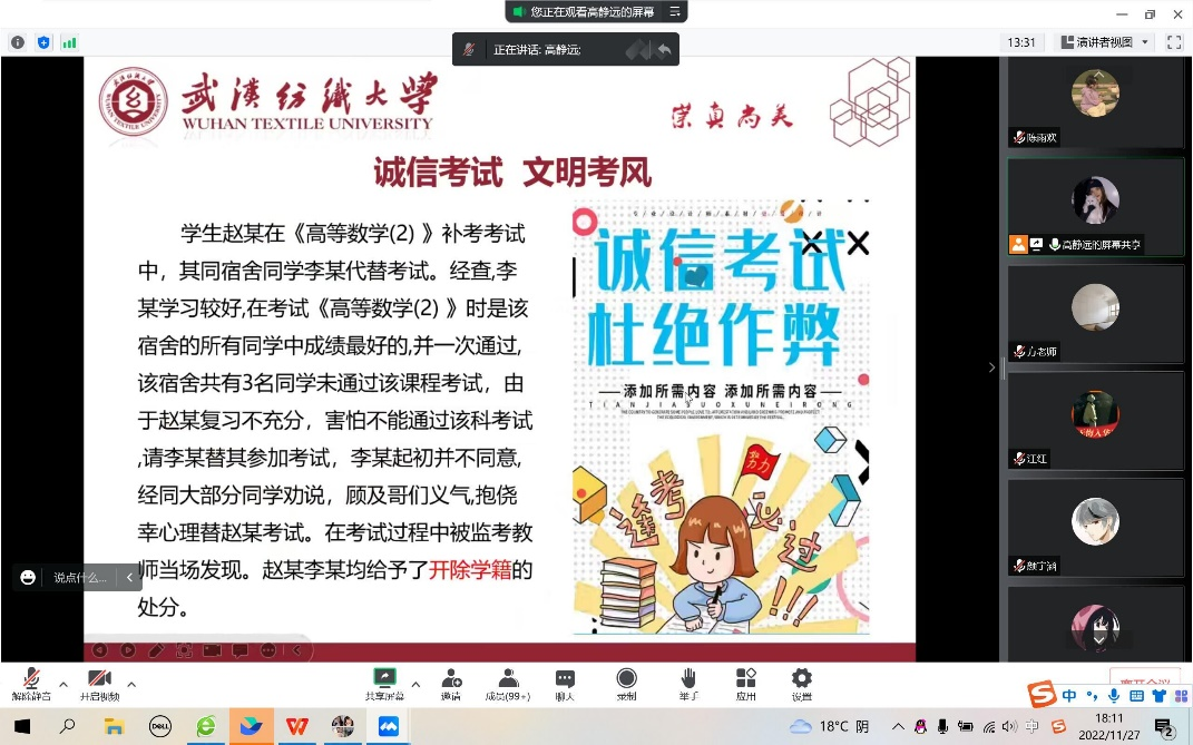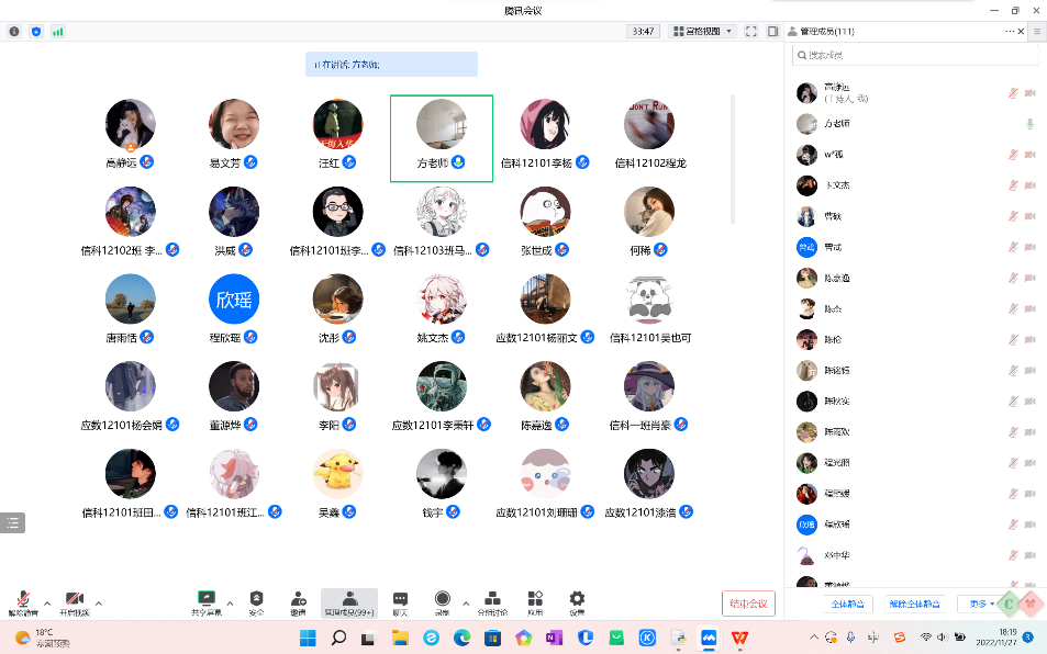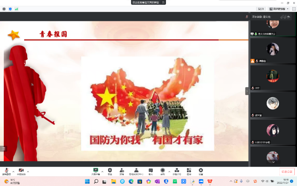 为鼓励大学生积极参与应征入伍,加强同学们对于大学生征兵政策的了解,充分调动同学们报名入伍的积极性,11月27日,数理科学学院21级开展线上“征兵入伍”主题宣讲年级大会。本次会议由年级长高静远主持,辅导员方媛及21级全体同学参加此次会议。
