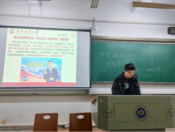 会议伊始,各班播放了徐卫林校长《开讲啦》的舞台,徐卫林校长在《开讲啦》的舞台上,以专业的视角和生动的讲述,向观众们展示了纺织领域令人惊叹的黑科技。这不仅提升了我校在全国范围内的知名度,也为广大学子树立了追求科技创新的榜样,激励着他们在各自的专业领域勇攀高峰。