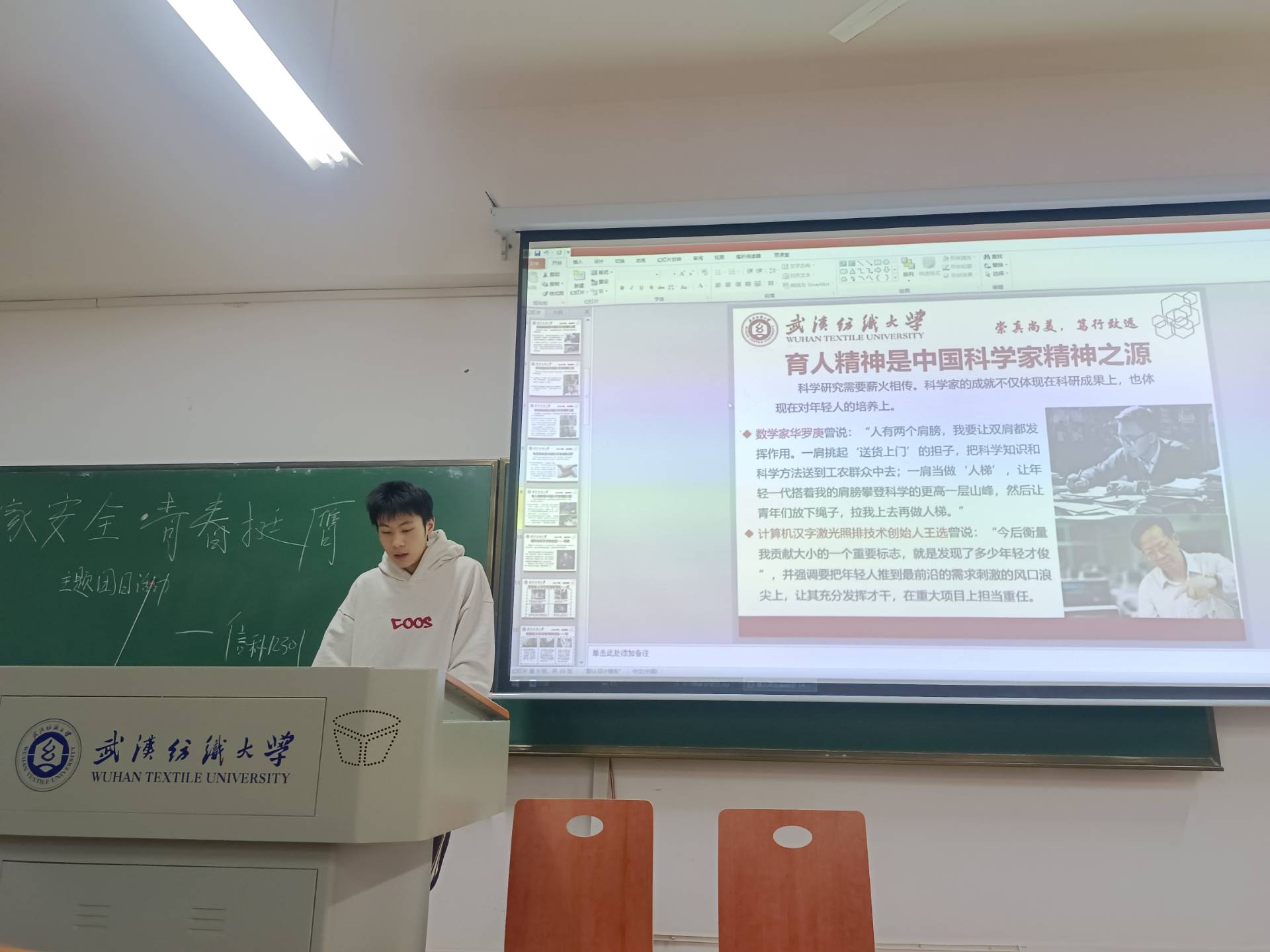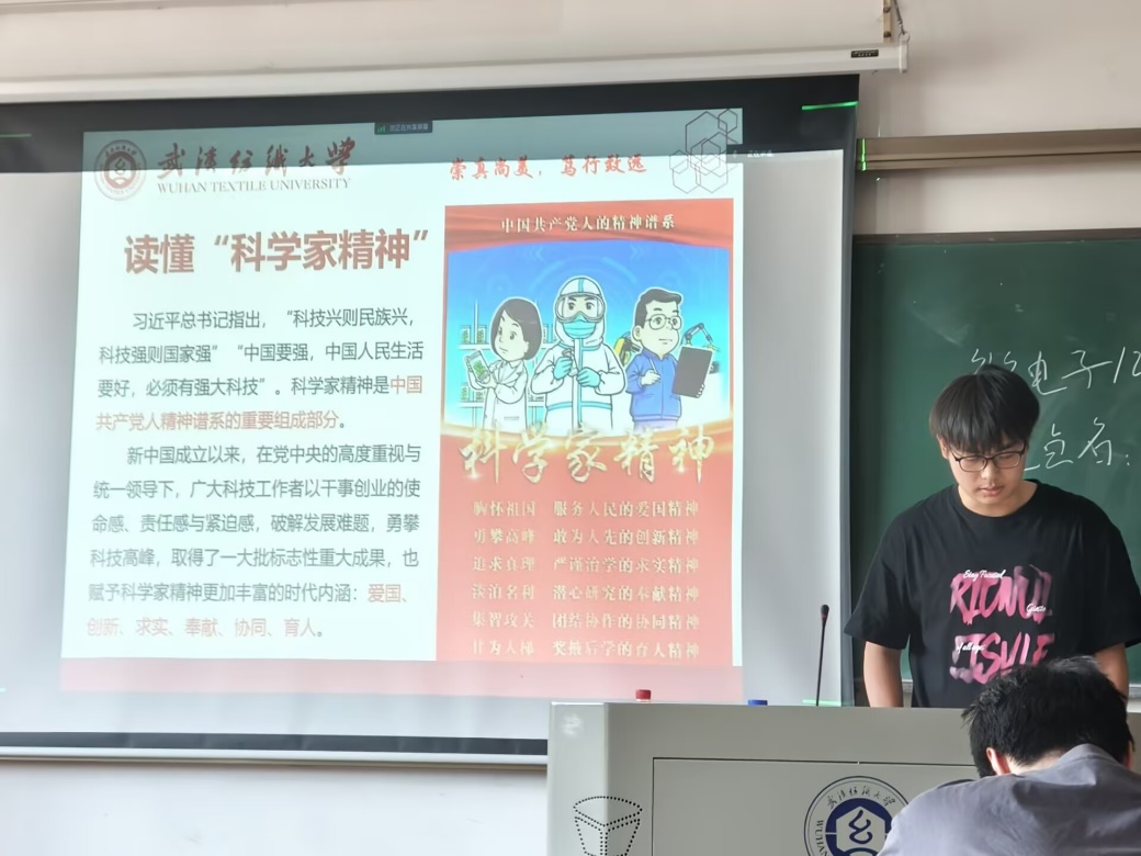 随后,各班团支书和全体学生还一起缅怀了纺织科学的巨匠姚穆先生,他以“忍、韧、仁”的科学家精神,在纺织领域默默耕耘,为我国纺织工业和教育事业做出了巨大贡献。同时,介绍了纺织领域的科学家徐卫林和孙以泽,他们的科研成果不仅填补了国内外科研空白,还应用于国家重大航空航天工程,展现了科学家们在不同领域的卓越成就。