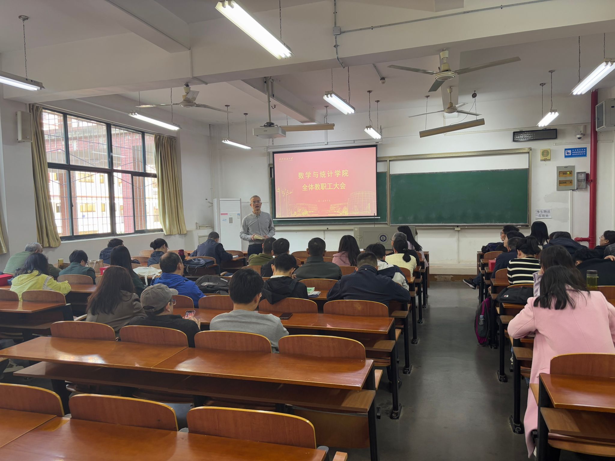 在3号教学楼108室召开全体教职工大会,学院党委书记段溢波主持会议。
