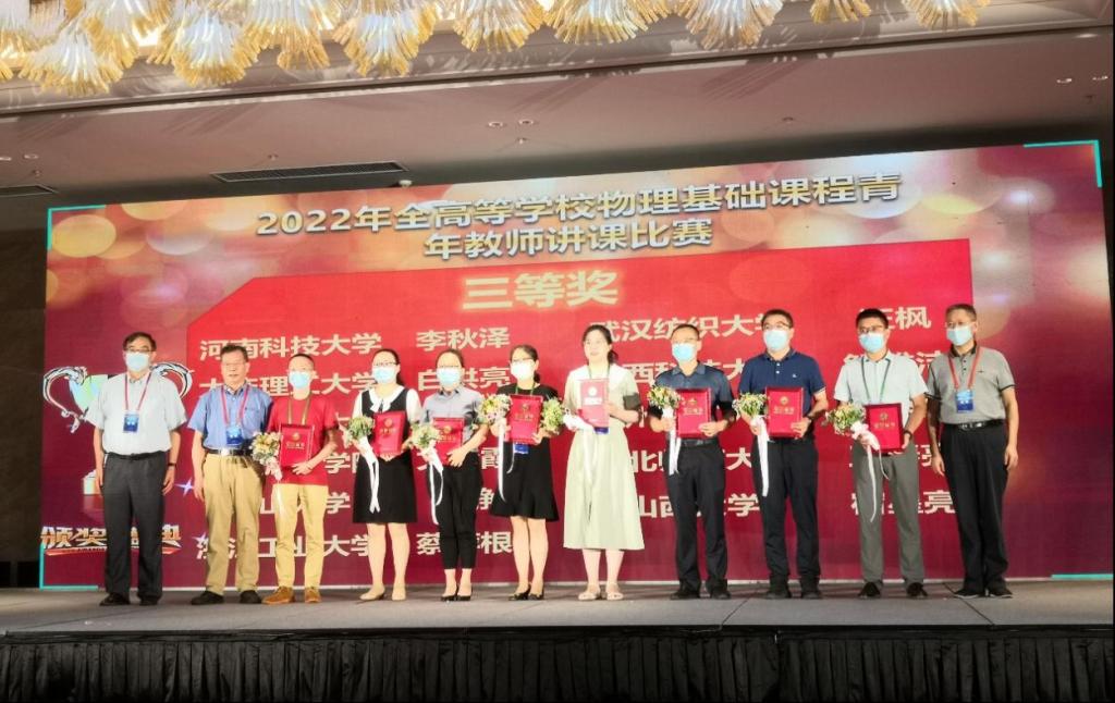 8月5日-8日,2022年全国高等学校物理基础课程(实验)青年教师讲课比赛在东北师范大学圆满举行,大赛由教育部高等学校大学物理基础课程教学指导委员会和中国物理学会物理教学委员会联合举办,东北师范大学承办。我校数理科学学院汪枫老师一路披荆斩棘,经过湖北省预赛(获特等奖),中南赛区复赛(获一等奖)的激烈角逐,进入全国舞台,与来自全国六大赛区的21名一等奖获得者同台竞技,荣获三等奖。
