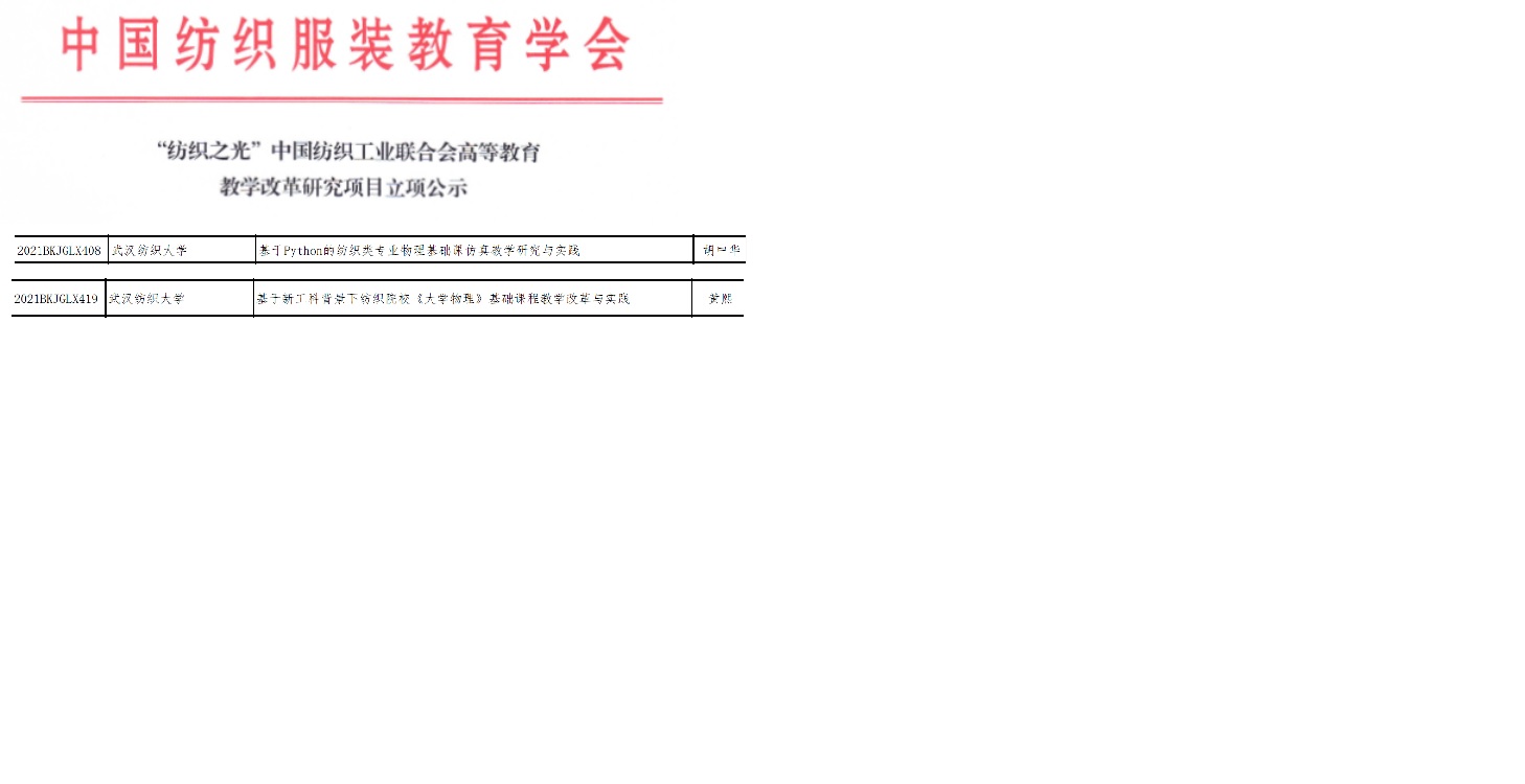 2021年,我校大学物理AI、大学物理AII分别获批湖北省线上线下一流课程和线下一流课程,课程团队紧紧围绕教学资源建设和教学模式改革,开展多方面教学研究。自课程获批以来,团队多位成员获批多项教研项目,团队成员黄熙老师、胡中华老师获批2021年中国纺织工业联合会高等教育教学改革项目。