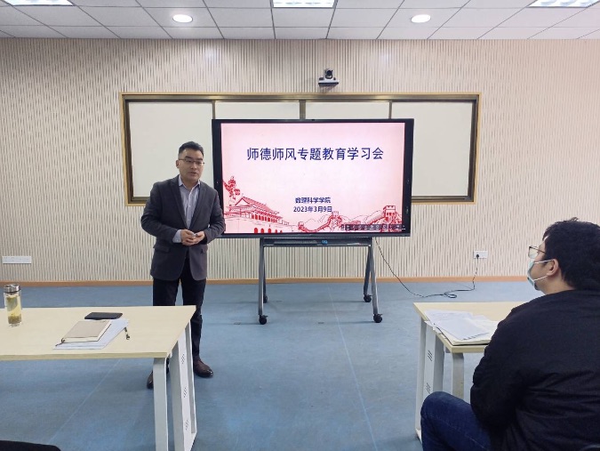 为不断规范教师职业行为,持续推进师德师风建设,3月9日下午,数理科学学院在崇文楼205会议室开展师德师风专题教育学习。学院全体教职工参加,院长汪胜祥主讲,党委书记段溢波主持。