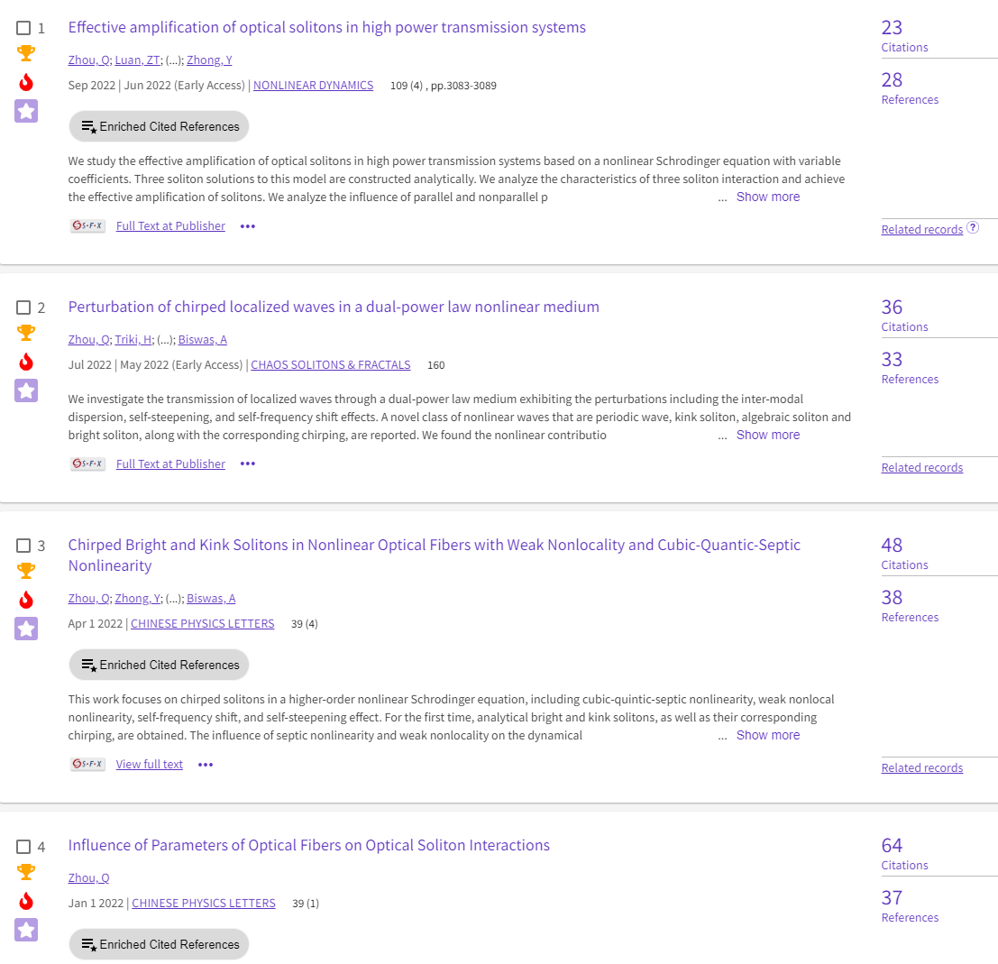 近期,我校周勤教授的“非线性光科学与技术”研究团队(以下简称光学团队)依托纺织新材料与先进加工技术国家重点实验室和数理科学学院非线性中心在非线性波领域的研究取得系列新进展,成果相继发表在Chaos, Solitons and Fractals、Nonlinear Dynamics、Chinese Physics Letters(中国物理快报)、Communications in Theoretical Physics(理论物理通讯)、物理学报等国内外专业期刊。