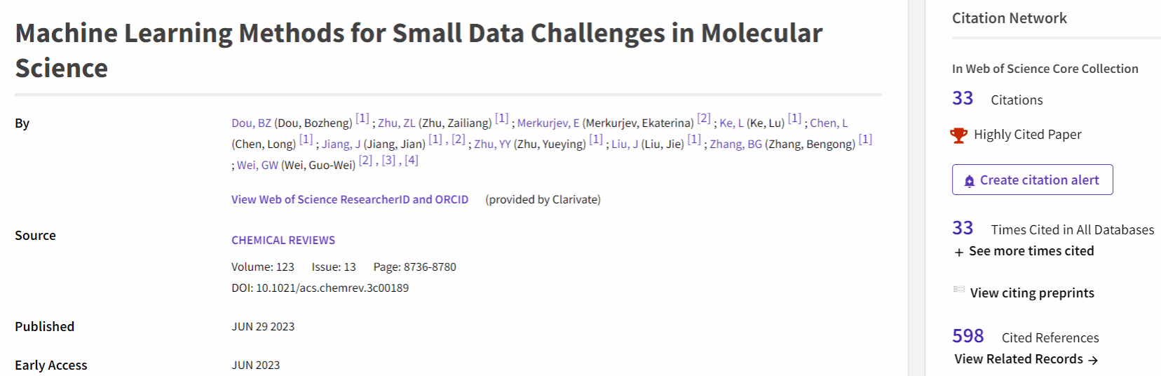 最近,根据Essential Science Indicators(简称ESI)更新数据显示,我校数理科学学院江健教授为第一通讯作者,其研究生窦博正为第一作者并以我校为第一单位在化学领域顶级期刊《Chemical Reviews》(影响因子62.1)上发表的论文“Machine Learning Methods for Small Data Challenges in Molecular Science”(Chem. Rev. 2023, 123, 8736−8780)成功入选化学学科领域全球前1%ESI高被引论文。该论文也是我校历史上影响因子最高的期刊论文。
