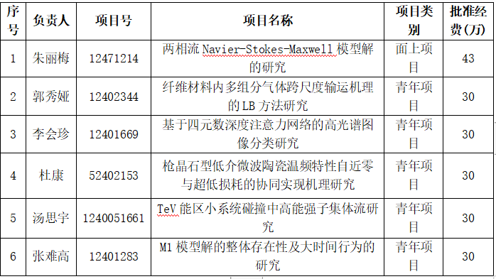 科研创新,引领未来。本次获批的项目涵盖了从基础理论研究到前沿技术探索的广泛领域,展现了学院科研团队的深厚底蕴与无限潜力。朱丽梅博士领衔的“两相流Navier-Stokes-Maxwell模型解的研究”,作为唯一的面上项目,以其深厚的学术积淀和前瞻性的研究视角,荣获43万元资助,成为我院在数学、流体力学及其交叉领域研究的新标杆。同时,郭秀娅、李会珍、杜康、汤思宇、张难高等五位青年才俊,在各自的研究领域内也取得了突破性进展,分别获得了30万元的资助,充分展现了我院青年科研力量的蓬勃生机与无限潜力。项目详细资助信息如下: