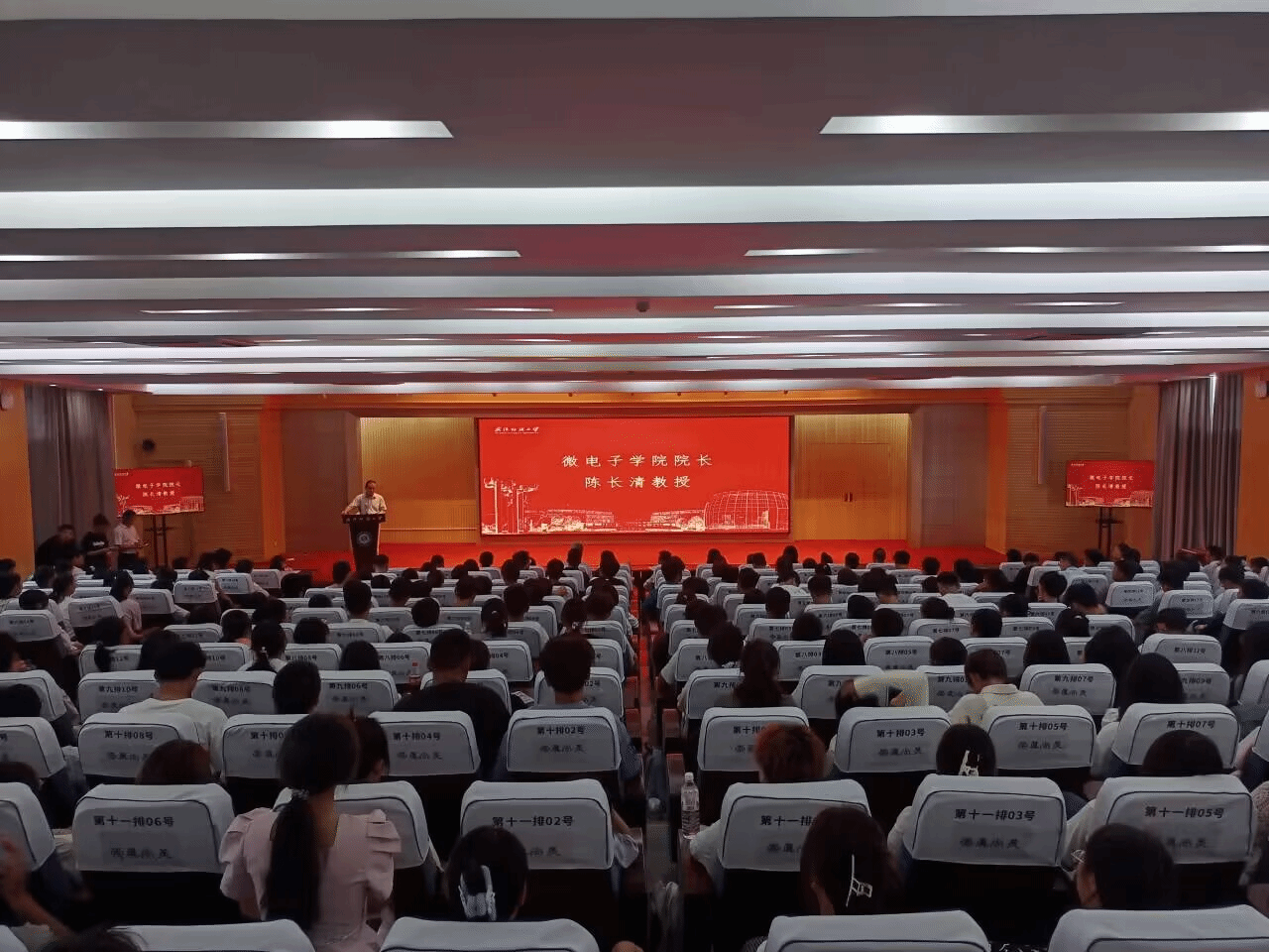 数理学院和微电子学院2024级新生开学典礼。今天和各位踌躇满志、意气风发的同学们如期相聚,我由衷地感到欣喜。我谨代表微电子学院全院师生向你们表示热烈的祝贺和诚挚的欢迎!你们的到来将为学院注入新的活力,你们也将在这里开启人生新的篇章。