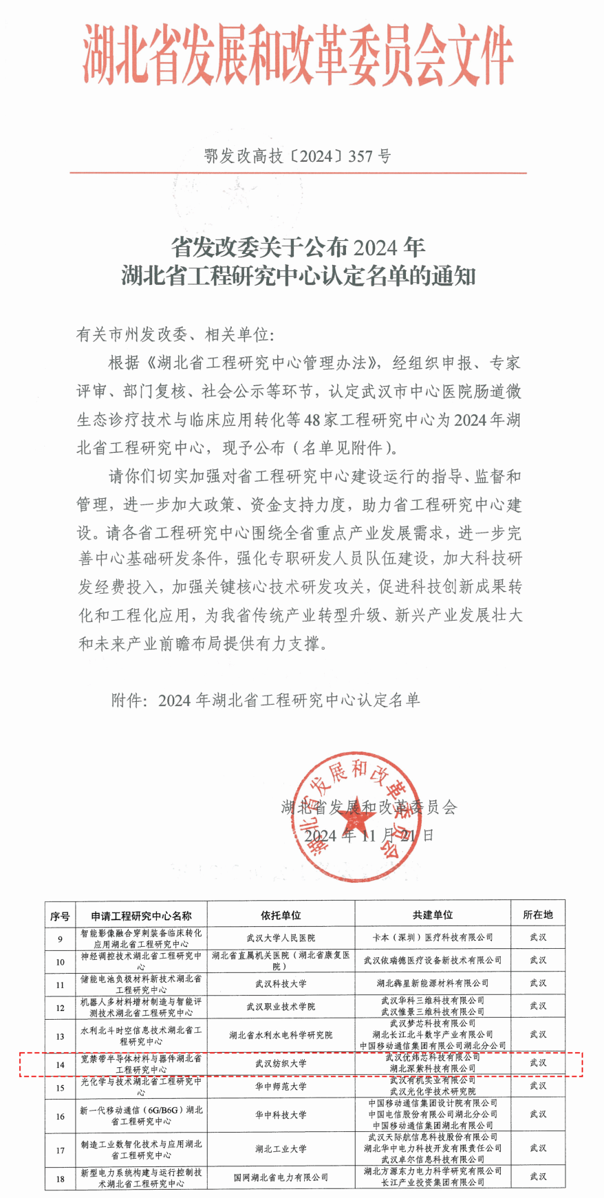 省级科研平台实现历史跨越。“宽禁带半导体材料与器件湖北省工程研究中心”喜获省发展和改革委员会批复。我校携手武汉优炜芯科技有限公司、湖北深紫科技有限公司共筑高级别科研平台,挂靠微电子学院,由微电子学院陈长清院长领衔,紧跟市场需求,追踪科技前沿,精准布局关键领域,持续推动宽禁带半导体的技术创新与应用,助力区域及全国相关产业链的培育与关键技术的提升发展。