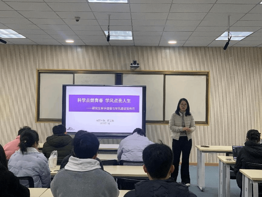 遵守学术规范是科研创新和学术探索的基石,恪守学术道德是科研人员的基本准则和道德底线。为深入贯彻党的二十大精神,全面落实习近平总书记关于弘扬科学家精神和加强作风学风建设的重要指示,进一步强化学术规范和学术道德的宣传教育,加强研究生学风建设,积极营造求真务实、诚信严谨的学术氛围。数理科学学院 微电子学院于2025年1月9日上午在04-205教室举行“科学点燃青春 学风点亮人生”主题教育班会。班会由学院副院长郑仟教授主讲,辅导员、德育导师、部分老师及全体研究生共同参加。