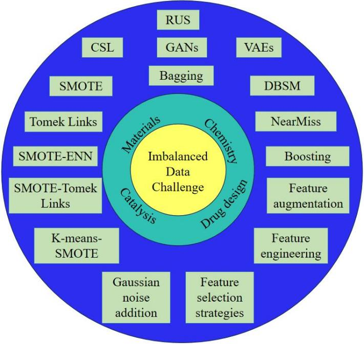 数据不平衡是指在一个数据集中某些类别显著代表性不足的情况,这是一个药物设计领域广泛存在的机器学习难题,然而目前对它的处理仍不够充分。这种数据不平衡可能导致有偏差的机器学习或深度学习模型,这些模型无法准确预测代表性不足的类别,从而限制了这些模型的鲁棒性和适用性。随着机器学习和深度学习算法的快速发展,针对这一问题已经出现了一些很有前景的解决方案,这就促使我们有必要对当前的方法进行全面回顾。在这篇综述中,我们研究了在化学不同领域中用于应对数据不平衡挑战的主要机器学习方法,包括重采样技术、数据增强技术、算法方法以及特征工程策略。我们在化学的各个研究方向(如药物发现、材料科学、化学信息学和催化)的应用背景下对每种方法进行了评估。