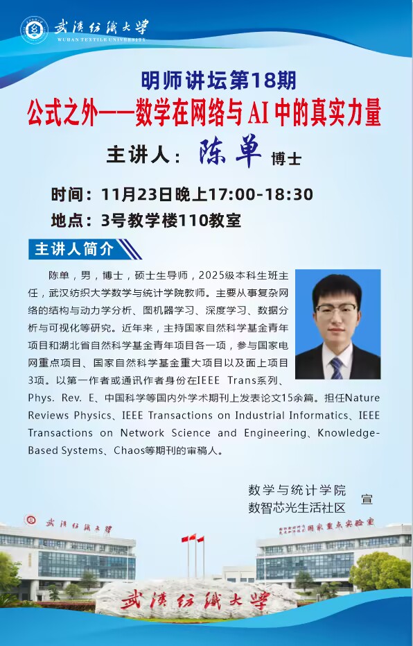 讲座开篇,陈单博士通过社交网络、电力网络、大脑神经连接等生动案例,阐释了复杂网络的本质——作为贯穿自然与人类社会的通用语言,其核心可通过数学工具精准解码。他重点介绍了图论在网络分析中的基础作用,从节点度分布、无标度性质到小世界效应,用直观的可视化图表展示了“六度分离”理论的科学依据,以及巴拉巴西教授提出的BA无标度网络模型如何揭示复杂网络的演化规律。高等代数的应用同样令人瞩目,谷歌PageRank算法凭借邻接矩阵的特征值分解成为搜索引擎革命的关键,印证了数学工具的实践价值。