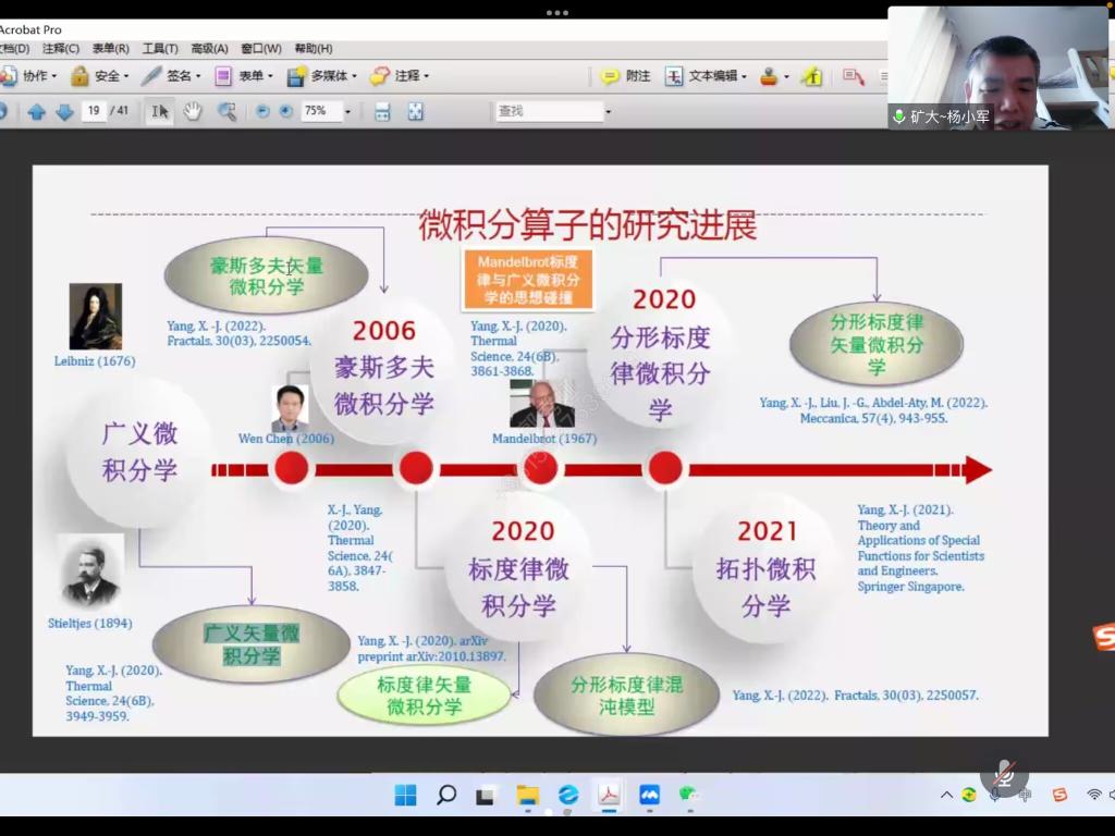 杨小军研究员从特殊函数的研究进展、微积分算子的研究进展、特殊积分变换、幂律流体力学的猜想、悟空效应和其它猜想等六个方面详细介绍了团队的原创性成果,比如首次提出了超越几何三角函数和超越几何双曲函数理论,填补了国内外在该领域内的空白;系统研究了广义微积分学理论,形成了分数阶微积分学领域的新分支;解决了千禧难题,完成了标度流体力学的新挑战;研究分形标度律混沌方程,发现了“悟空效应”等。杨小军研究员的科研成果获得了国际同行的广泛认可和关注,并荣获了国际Obada奖(杰出科学家)、阿塔纳西耶·斯托伊科维奇奖和Abel奖等众多奖项,体现了他在基础研究领域做出的原创性贡献。最后,他勉励老师和同学,做基础研究要静下心,沉住气,多读经典著作,这样才能做出原创性成果!