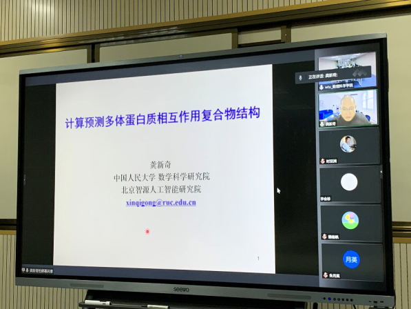 为学习宣传贯彻党的二十大精神,大力促进学科交叉、加强团队合作、提高学术能力、增强学术自信,在学院大力支持下,第231期阳光论坛暨第57期学术沙龙活动于11月11日在数理科学学院206教研室成功举办。本次活动邀请中国人民大学数学科学研究院龚新奇教授做题为“计算预测多体蛋白质相互作用复合物结构”的线上报告。本次活动由数学与应用数学系主任江健教授主持,副院长郑仟副教授,数学专业的相关老师以及全体研究生同学参加了本次研讨活动。