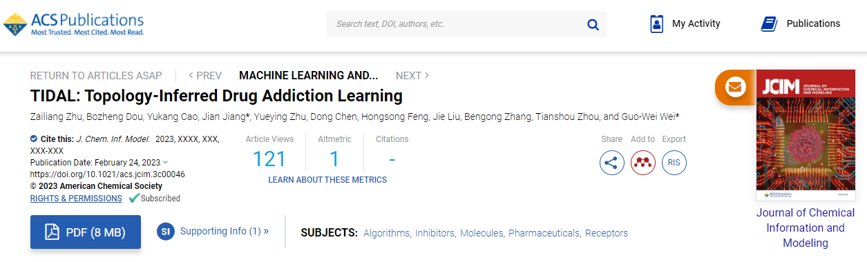 近期,数理科学学院大数据分析与处理科研团队成员江健教授与其合作者在药物设计及开发方向取得重要研究进展,相关成果以“TIDAL: Topology-Inferred Drug Addiction Learning”为题在该领域国际知名期刊Journalof chemical information and modeling上发表。该论文的第一作者为团队硕士研究生朱在亮,江健教授为第一通讯作者。