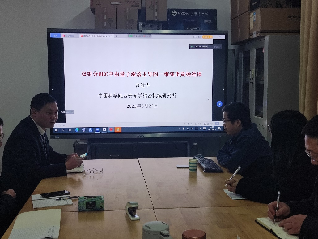 数理科学学院邀请中科院西安光机所的曾健华研究员作题为“双组分BEC中由量子涨落主导的一维纯李黄杨流体”的学术报告。此次论坛由学院物理学科带头人周勤教授主持,学院相关方向的老师、研究生和本科生参加,会议在4-103举行。