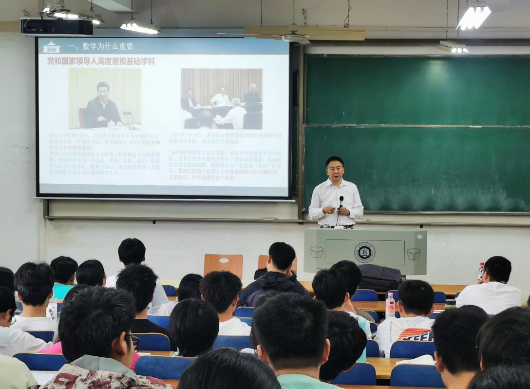 汪思明从最近大热的人工智能切入,他指出,所谓“智”与“能”,“智”,就是算法决定了人工智能的智力高低,是未来智力比拼胜出的关键;而“能”,也就是算力(运算速度)决定了人工智能的能力大小。引导同学们充分认识到数学的重要价值。汪书记从数学的重要性、考研与就业、职业发展、如何成就自己四个方面为大家作详细阐述。他结合武大、北大、山大、华科学子毕业去向,为大家阐述数学专业毕业学生可以多方向、多领域发展。他以详实的科学家、企业家的例子鼓励学生进一步提升自我发展,在学习和生活中要培养坚韧不拔、勤奋刻苦的品质。