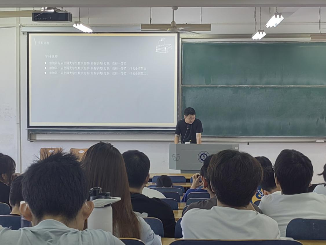 二手市场小程序的设计与实现》、《药物机械分子的机器学习预测》。他们都提到,只有多参加学术竞赛活动来拓宽自己的视野,才能更好地学习数学、提高能力。罗淑杰学姐真诚分享考研心得和体会,以及如何充分备战考研。周钰学长向同学们分享他在纺大参与数学竞赛的历程以及学习数学的学习方法和数学书籍推荐。周钰学长强调:学习数学最重要的是学习方法,其一是学会“追根溯源”,即深入了解数学知识背后的原理和推导过程,不仅仅是记住公式、方法和结论,而是要理解其由来和推演过程,以此建立数学知识的系统性和连贯性;其二是不要追求只“看懂”书上的过程,而是要注重理解和掌握数学知识的思维方法和本质,而不是仅仅记住一些例子和步骤;其三是可适当掌握“高屋建瓴”的思想,也就是应该从整体出发,理解知识点的背景和原理,掌握不同知识点之间的逻辑关系,做到全面深入地掌握数学知识,从而建立起完整的数学框架。