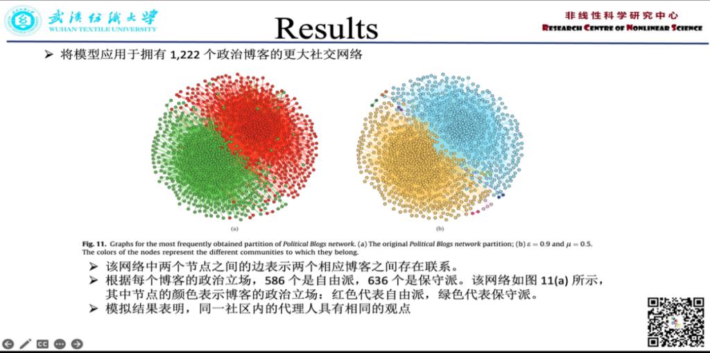 黄海芳:本次汇报了一篇名为《On The Role of Community Structure in Evolution of Opinion Formation: A New Bounded Confidence Opinion Dynamics》的文章。其主要建立了一个新颖的有界置信意见动态模型。LPA-HK模型在Hegselmann-Krause(HK)模型的基础上引入标签传播算法(LPA),从演化过程的微观角度研究观点演化与社区划分的关系。 每个代理都有一个意见以及一个指示代理社区的标签。 智能体状态的迭代涉及两个阶段:标签更新和意见更新。代理人的标签和意见动态变化,直到群体达到稳定状态。进行模拟来检查模型参数对意见演变和社区划分的影响。结果表明,当置信水平增加到临界值时,小组达成共识,并且当置信水平大于临界值时,获得高质量的分区。