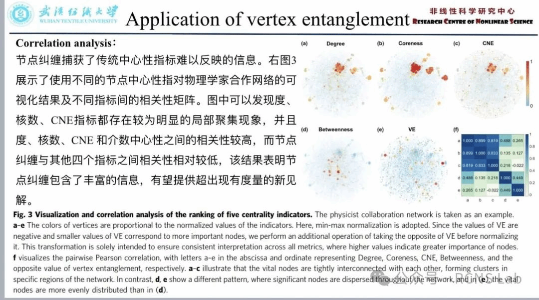 杨凤鸣 :本次汇报了一篇文献《Identifying key players in complex networks via network entanglement 》,该研究受量子信息论启发,创新性地提出了复杂网络中节点纠缠的概念,并利用节点纠缠识别复杂 网络中的关键节点。该方法不仅考虑了复杂网络的局部结构和拓扑信息,而且也考虑了网络的全局 信。研究发现,在极小的时间尺度下,节点纠缠趋于0,而在极大时间尺度下,节点纠缠度可以反 映网络的连通性。在中观尺度上,节点纠缠度同样发挥着重要的作用,可以衡量节点对系统传输性 质的影响。节点纠缠使人们对复杂系统内在的拓扑属性有了新的认识。应用层面,最优网络拆解仍然是一个开放的问题,本文提出的节点纠缠则提供了一种用于网络拆解的新框架;此外,节点纠缠还可以应用于自闭症谱系障碍的诊断支撑,基于节点纠缠的枢纽中断指数在自闭症患者和典型对照组之间存在显著差异,为自闭症诊断提供了有力的工具。节点纠缠作为一种多尺度的网络分析工具,其应用不限于上述领域。在未来的研究中,节点纠缠可能会在更多领域展现其价值,如社交网络分析、生态系统管理、经济网络优化等。节点纠缠方法将量子信息理论的概念应用于复杂网络分析,推进了网络科学与量子物理的交叉融合,不仅推动了理论研究的深入,也为实际问题的解决提供了新的视角和策略。