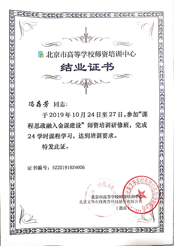 10月24日-27日,电子电气学院大学物理课程思政团队成员教师冯存芳赴北京参加了第一期“课程思政融入金课建设”师资培训研修班,完成24学时课程学习,达到培训要求。此次培训由北京市高等学校师资培训中心、北京文华在线教育科技股份有限公司主办,人民网公开课频道协办。
