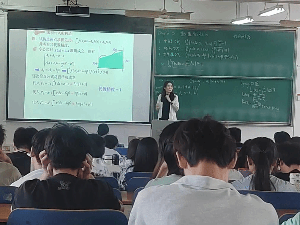 王会利老师首先复习了前面章节中的重要内容,并强调了本章的重要意义,运用图文并茂、辅助动画演示的多媒体课件,结合黑板板书讲解了数值求积公式的基本原理。巧妙通过问题引导同学们明确数值方法的构造原理,明晰具体问题如何解决。整个观摩课,师生互动积极,课堂气氛活跃,授课极富感染力,充分调动了学生的主动性,激发了学生的学习兴趣。观摩课后,老师们与王会利老师进行了交流和讨论,对个别教学环节提出了非常中肯的建设性意见。