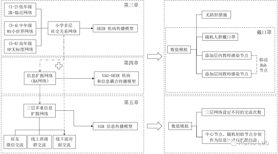 李朝辉:文章根据小学生不同年级的社交活动特点,将其构建为三层社交关系网络。分别在此网络结构基础上构建实验中的网络模型,如第三章中的社交关系网络,第四章中的信息和疾病耦合的两层多重网络,第五章中线上好友微信交流子网络、线上班级群交流子网络,线下接触面对面交流子网络,三层子网络耦合的多重网络结构。